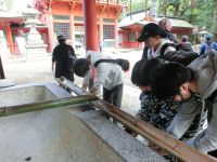 感染症防止のため柄杓が撤去された手水舎でお清め、楼門をくぐると本殿です。