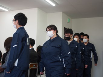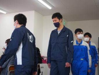 青いつなぎを着ているのは編入生等のみなさん。